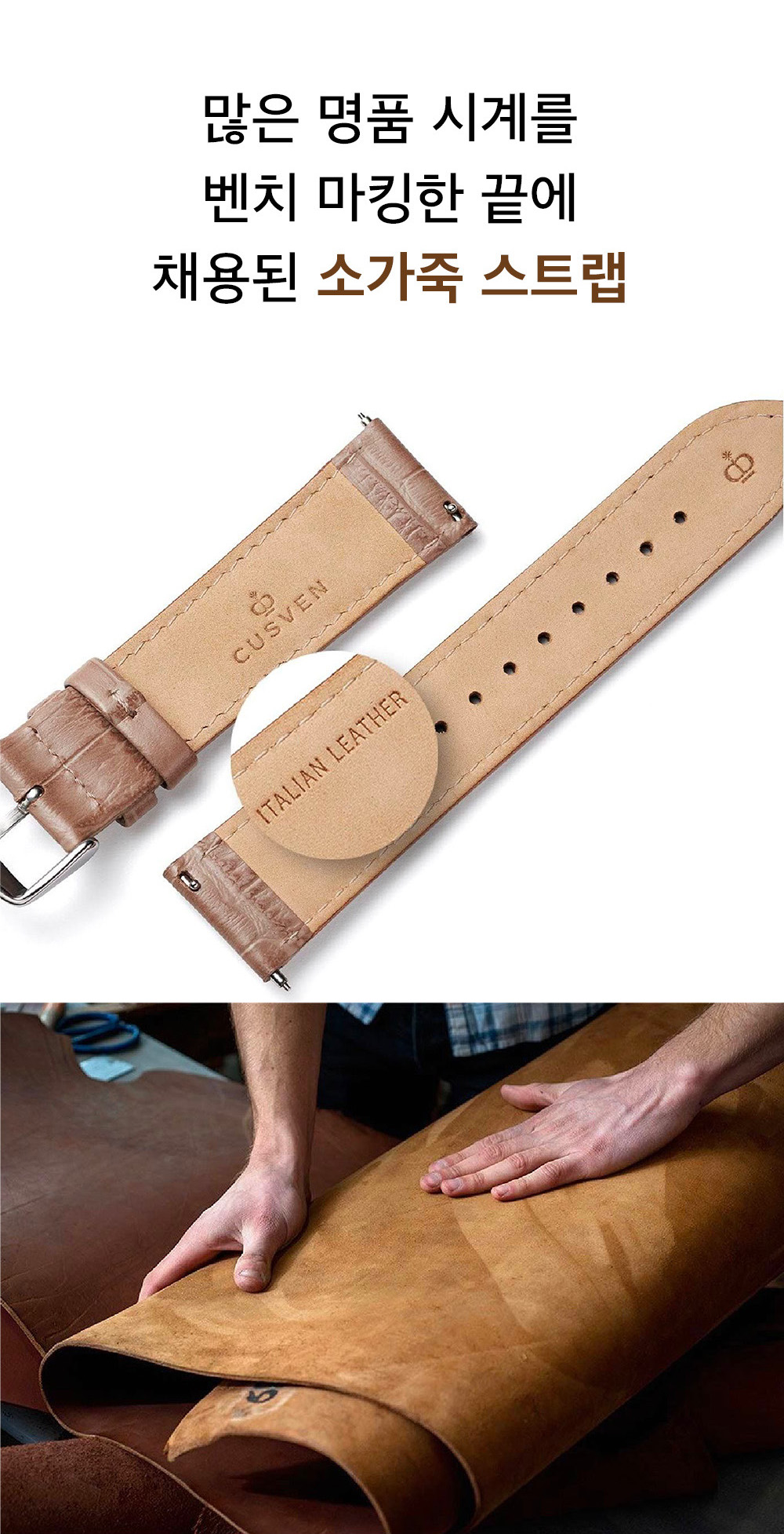 강하고 튼튼한 이태리 레더는 사용할수록 부드러워지며 손목을 편하게 감싸줍니다. 최적의 두께로 답답하지 않고, 명품에서 쓰이는 진하지도, 연하지도 않은 브라운 컬러를 그대로 가져와 예술적 디자인과 어우러집니다. 긴 세월을 당신과 함께하며 손때가 묻고, 주름이 생겨도 늘 아름답게 빛납니다.