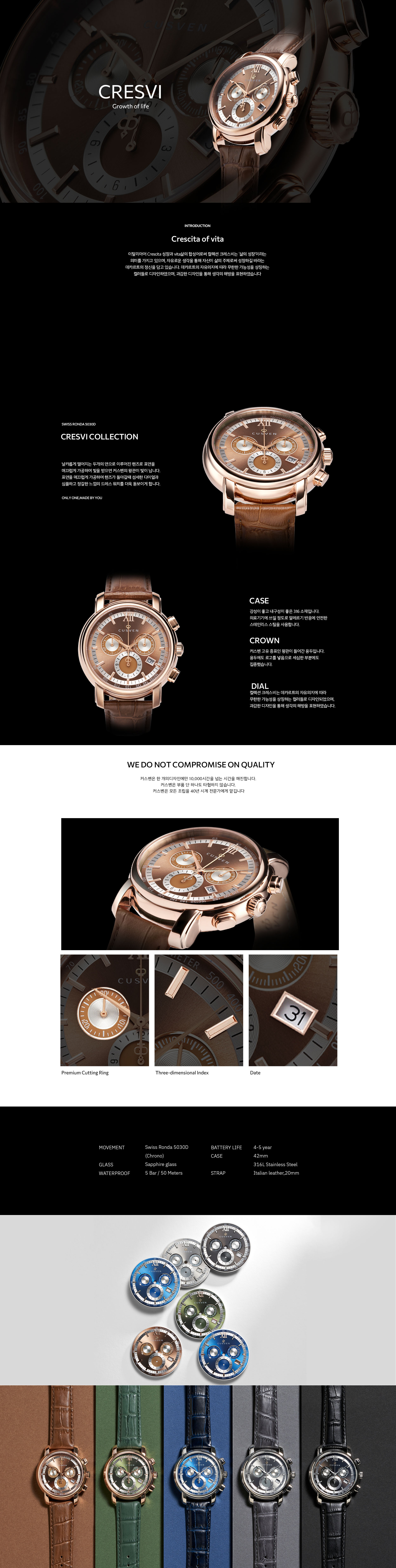 커스벤의 Cresvi Collection은 안정성과 높은 정확성을 갖춘 시계로, 무브먼트 동작성 / 배터리 / 크로노 기능 등 각종 테스트를 통과, 한국시계산업협동조합의 인증을 받은 제품입니다.