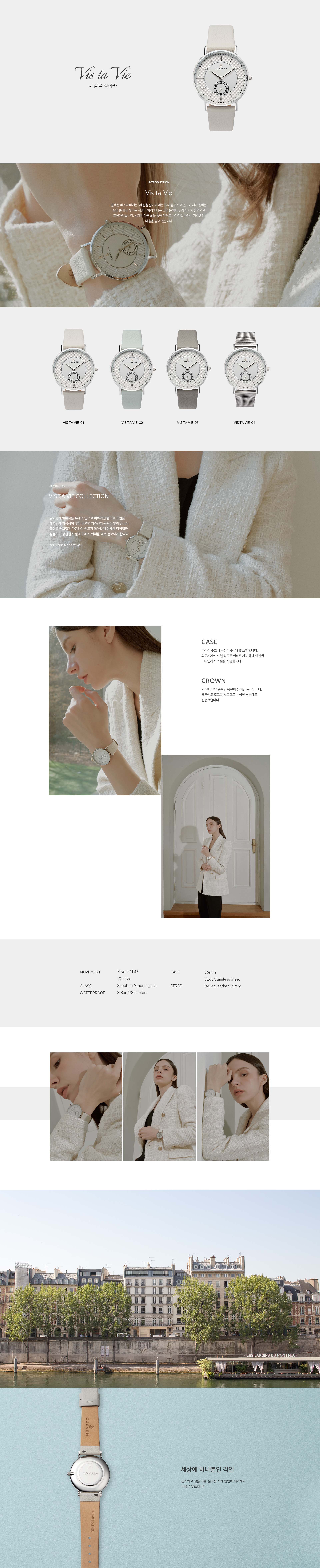 컬렉션 비스타 비에는 ‘네 삶을 살아라’라는 의미를 가지고 있으며 내가 원하는 삶을 통해 늘 빛나는 시절이 함께 한다는 것을 은색 테두리와 시계 전면으로 표현하였습니다. 남과는 다른 삶을 통해 미래로 나아가길 바라는 커스벤의 마음을 담고 있습니다